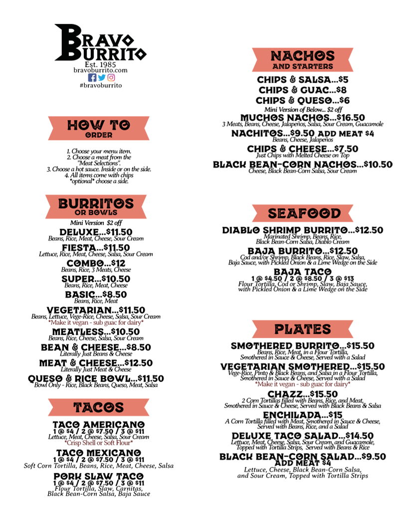 Welcome to the vibrant world of Bravo Burrito! Located at 68 33rd Ave S in St. Cloud, MN, this spot brings a fresh and exciting twist to your typical burrito experience. The Bravo Burrito Menu offers a variety of flavorful options, from the classic burritos stuffed with your favorite ingredients to unique creations that are sure to excite your taste buds. Whether you’re craving a hearty, savory bite or something light and fresh, there’s something for everyone. Each dish is crafted with care and a focus on quality, ensuring you leave satisfied with every visit. The menu doesn’t just stop at burritos - enjoy a selection of sides, drinks, and toppings that let you build your perfect meal. If you're looking for a satisfying meal that’s both fast and flavorful, Bravo Burrito is the place to be.